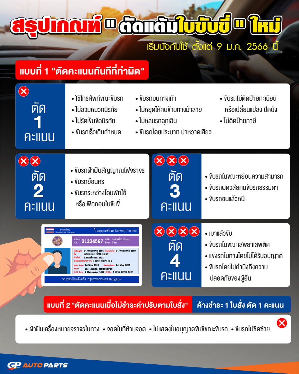 หากไม่อยากโดน”ตัดแต้มใบขับขี่” อย่าลืมเคารพกฎจราจรกันด้วยนะครับ และเพื่อความปลอดภัย สิ่งที่สำคัญไม่แพ้กันคือสภาพรถยนต์ ควรหมั่นตรวจเช็ครถยนต์ทุกครั้งก่อนออกเดินทาง หากมีชิ้นส่วนอะไหล่เสียหายต้องรีบเปลี่ยนทันทีนะครับ